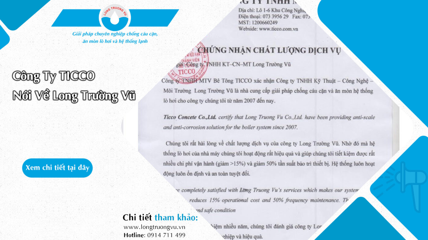 Đánh giá của Công ty Bê Tông TICCO là một minh chứng xác thực cho chất lượng dịch vụ chống cáu cặn và ăn mòn lò hơi của Long Trường Vũ. Nếu doanh nghiệp bạn đang tìm kiếm giải pháp xử lý hệ thống lò hơi hiệu quả, tiết kiệm chi phí và duy trì vận hành ổn định, Long Trường Vũ là lựa chọn đáng tin cậy.